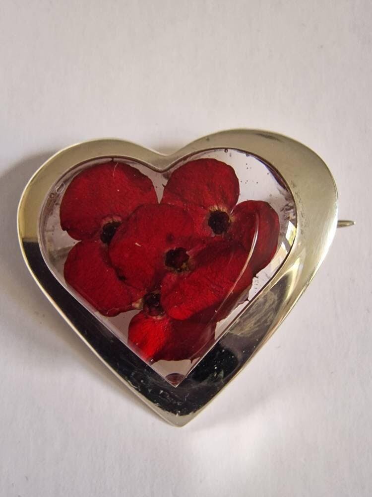 Poppy Brooch . Sterling silver heart brooch handmade with real flowers