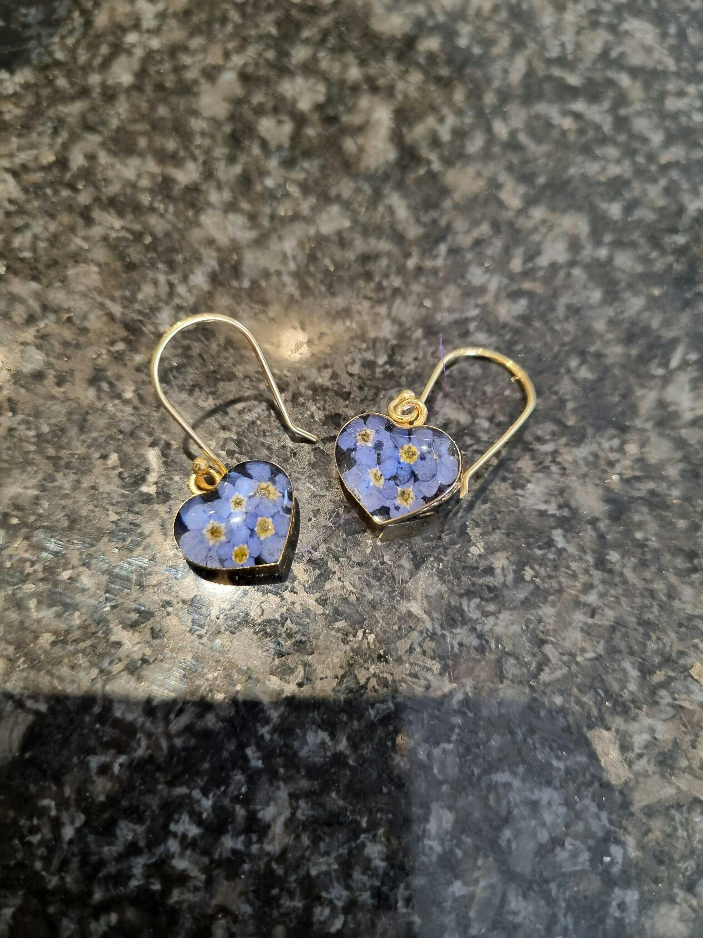 Pendientes de corazón de plata de primera ley bañada en oro con auténticas flores no me olvides. ¡Regalo perfecto para el día de la madre!