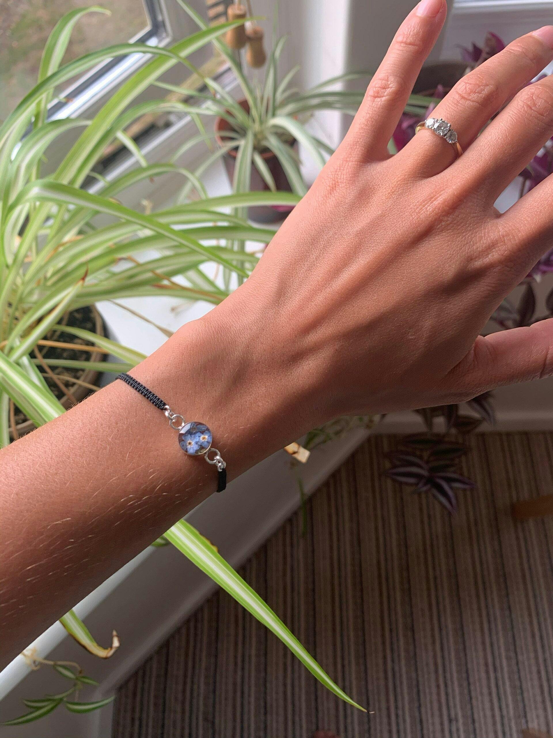 Bracelet tissé noir en argent sterling avec breloque fleur - Myosotis - Rond