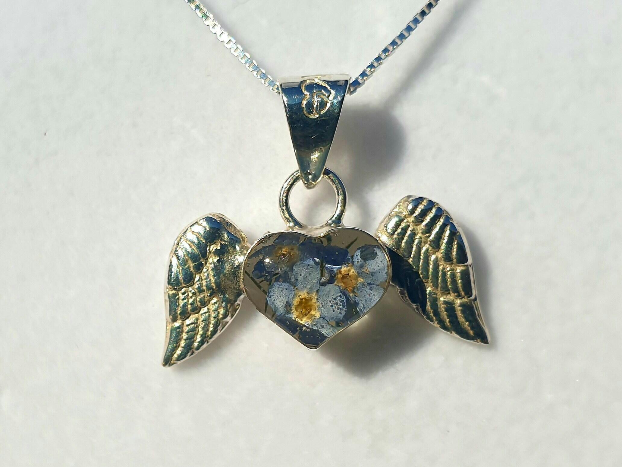 एक प्रतीकात्मक दिल और फरिश्ते के पंख का पेंडेंट जिसमें असली भूल-नहीं-मेरे फूल शामिल हैं। स्टर्लिंग सिल्वर में हस्तनिर्मित। इसमें लक्ज़री गिफ्ट बॉक्स और फूलों के अर्थ की पुस्तिका शामिल है।